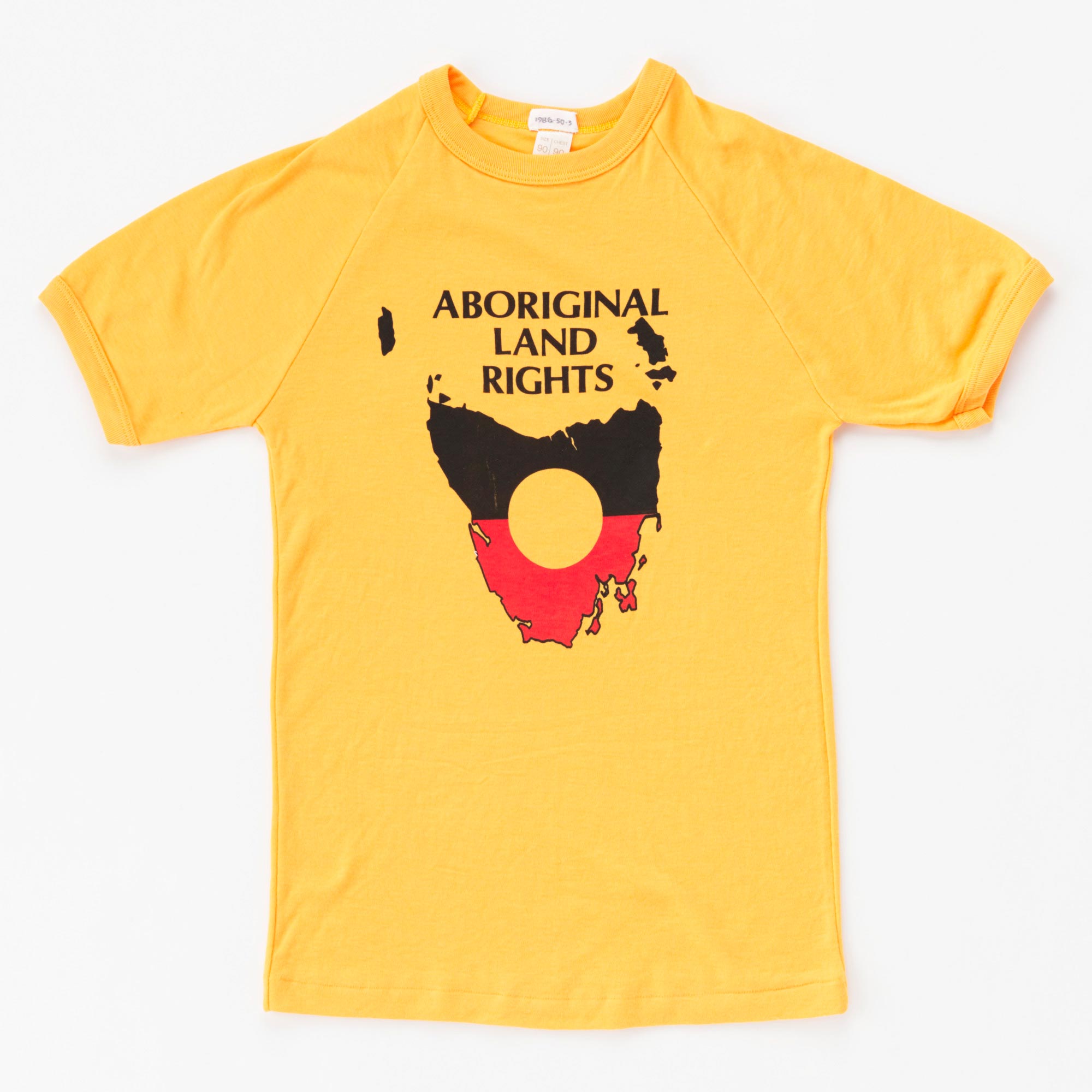 Yellow polyester cotton t-shirt with text reading Aboriginal Land Rights’. There is also a map of Tasmania with an Aboriginal flag inside.