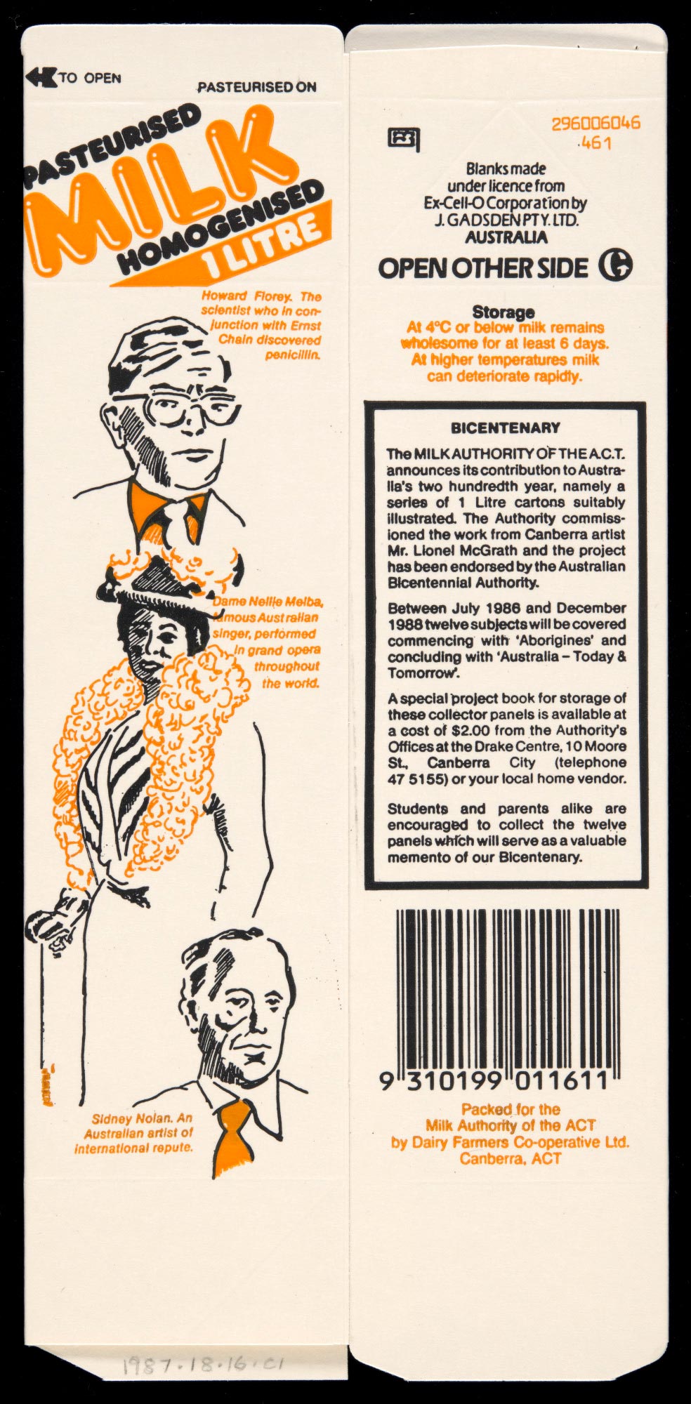 The tenth in a series of bicentennial milk cartons. The carton is white waxed card with printed text in a flat construction ready to be folded into shape.