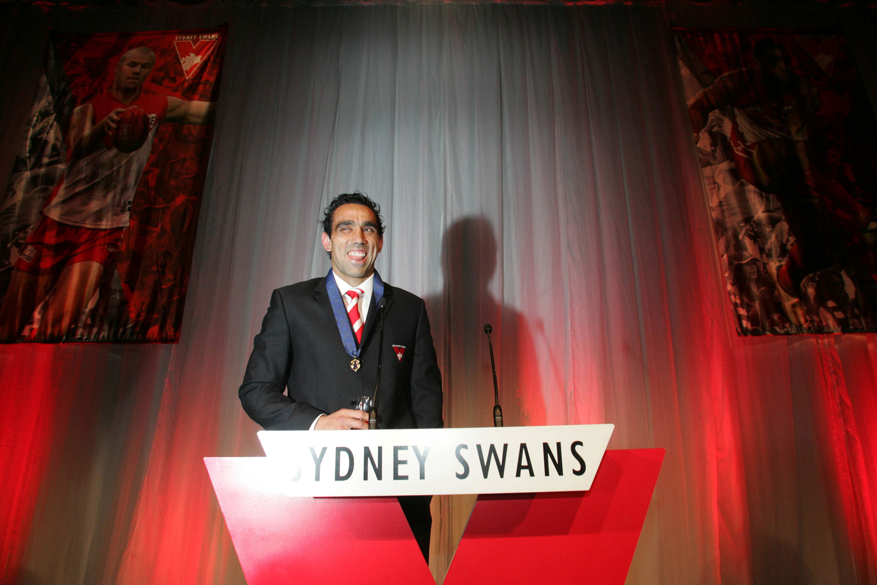 Sydney swan's AFL player Adam Goodes laughs on stage after winning his second Brownlow medal at the AFL Brownlow Medal Awards in Sydney, 25 September 2006. The Brownlow medal is awarded to the most outstanding player of the AFL season.