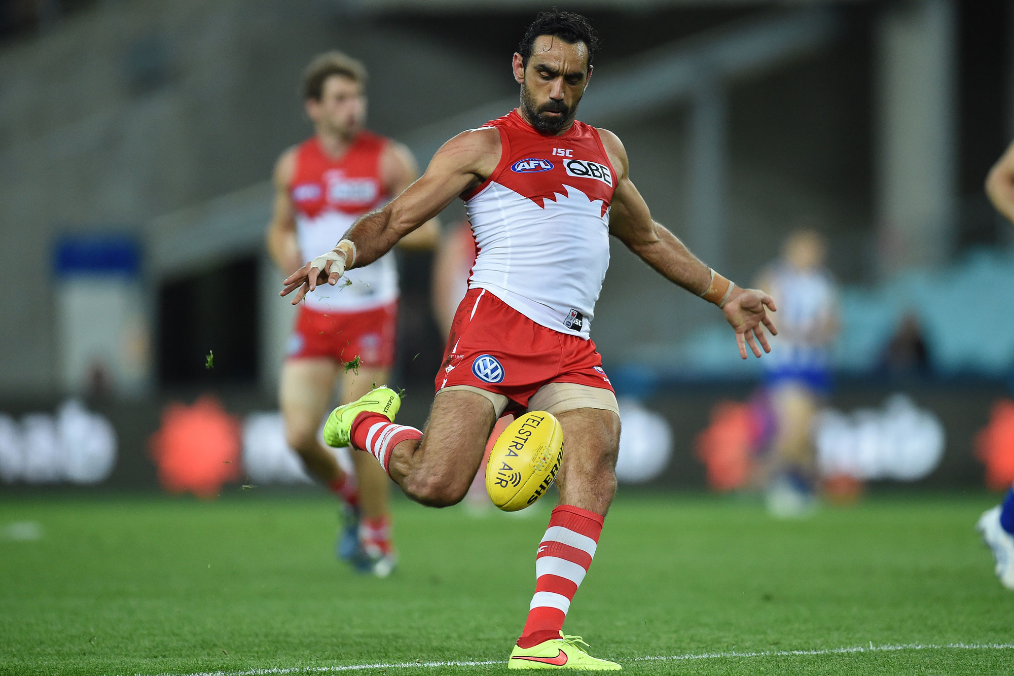 Adam Goodes of the Sydney Swans kicks the ball during the first AFL semi-final between the Sydney Swans and North Melbourne at ANZ Stadium in Sydney, Saturday, 19 September 2015.