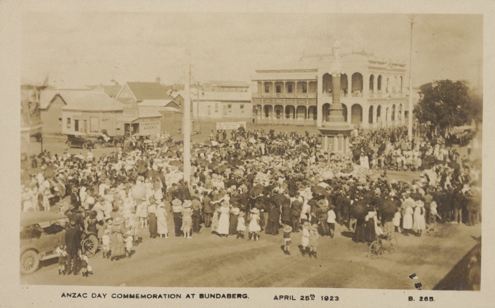 Photographic postcard of an ‘Anzac Day Commemoration at Bundaberg.’ The postcard has a message on the reverse, and is dated 25 April 1923.