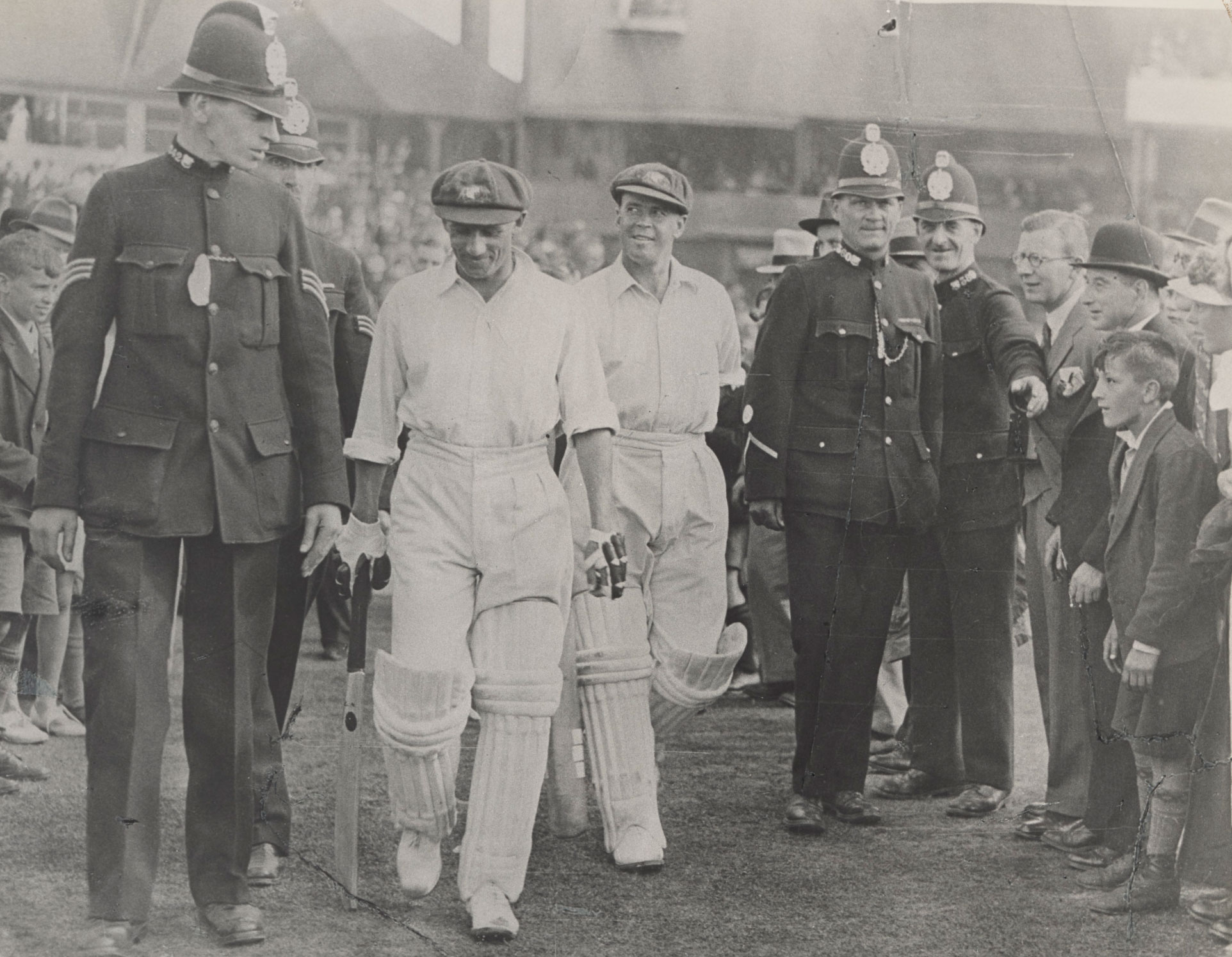 Australian batsmen Don Bradman and Bill Ponsford being escorted from the field by English police, 1934