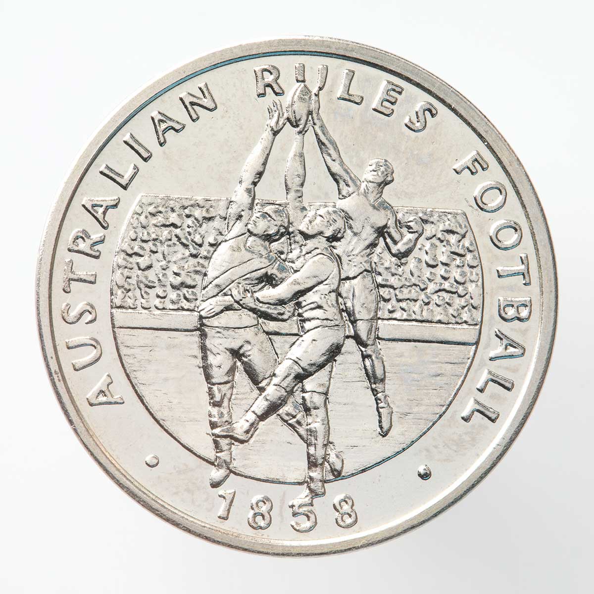 A silver coloured metal commemorative medal depicting Australian Rules Football. The front of the medal shows three footballers playing in front of a crowd with the text ‘Australian Rules Football’ and the date ‘1858’. The back contains text stating ‘Australia 200 years - A Bicentennial medal collection’ inscribed over a map of Australia with banksias and wattle plants surrounding the map.