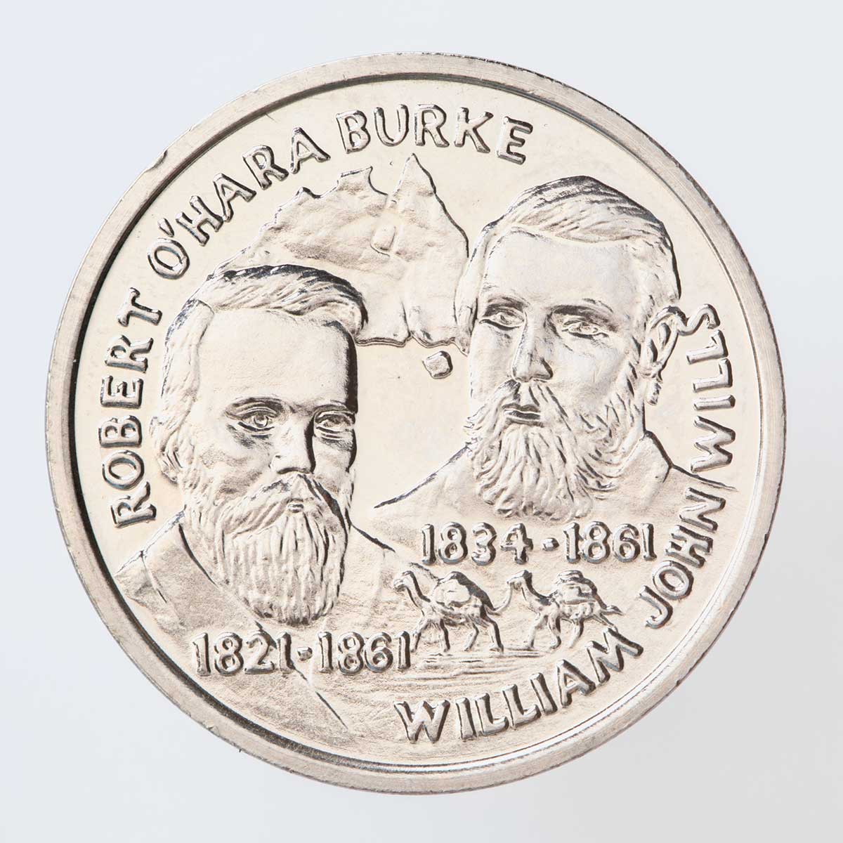 A silver coloured metal commemorative medal depicting the explorers Burke and Wills. The explorers are depicted on the front with their full names and dates written below with a small map of Australia in the background. The back contains text stating ‘Australia 200 years—A Bicentennial medal collection’ inscribed over a map of Australia with banksias and wattle plants surrounding the map.