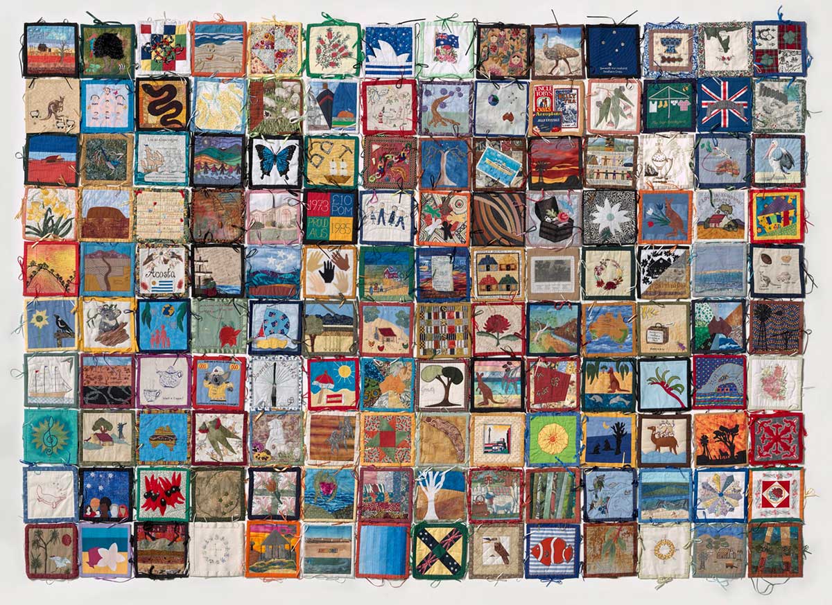 In 2005 the Australian Citizenship quilt was pieced together by the Canberra Quilters from squares contributed by Australian citizens. An initiative of the Department of Immigration and Multicultural and Indigenous Affairs in association with Better Homes and Gardens magazine, Australians were invited to craft squares on the theme of celebrating citizenship for assembly into an Australian Citizenship Quilt. Contributors were also asked to write a brief story about their journey to Australia or what it means to be an Australian citizen.