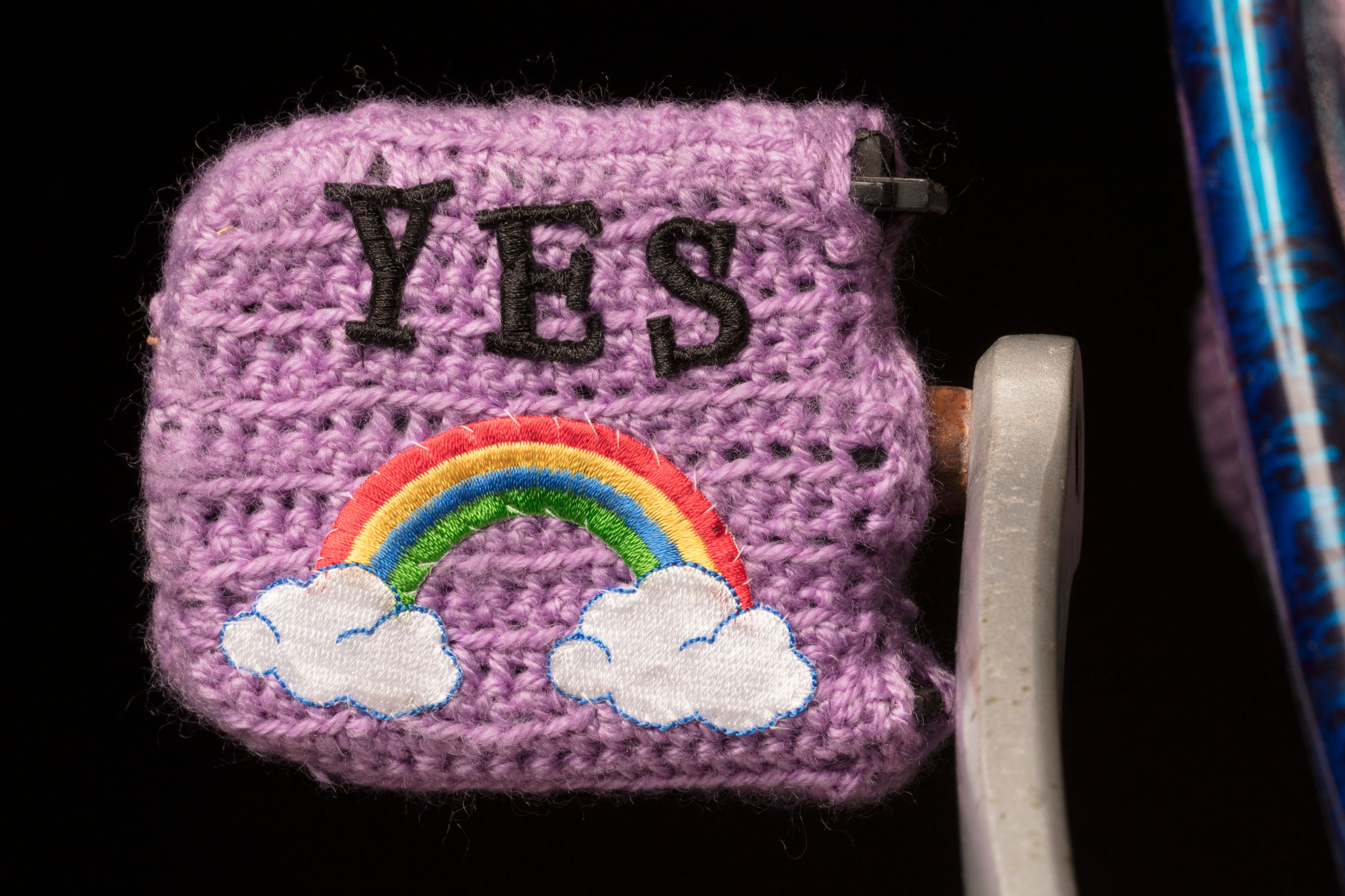 Bike pedal covered in woollen crochet and the word ‘yes’ embroidered on it