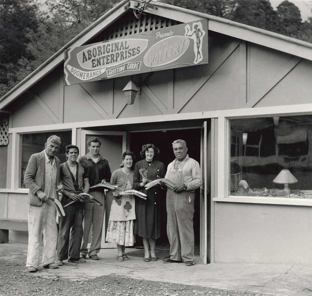 Bill Onus with his employees outside his boomerang factory, Dandenong Ranges, 1956