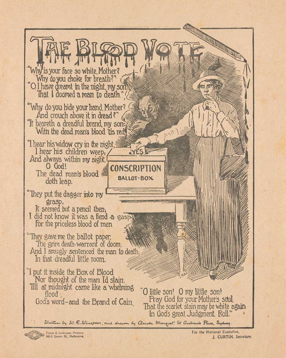 Black and white leaflet, with a poem titled ‘The blood vote’ printed on it, encouraging Australian women to vote against conscription during the First World War.