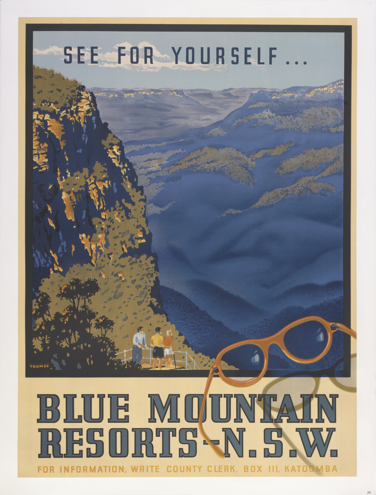 A printed colour poster featuring a landscape with an orange-yellow rock formation with trees on it to the left and people standing next to a railing in front of it. In the background are blue-green tree covered hills and a valley with large rock formations at the sides. In the foreground is a pair of orange spectacles and their shadow.