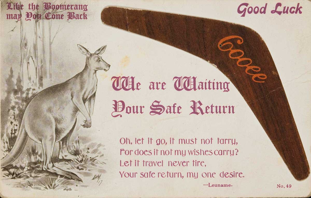 This postcard express the wish that the recipient might return ‘like the boomerang’.