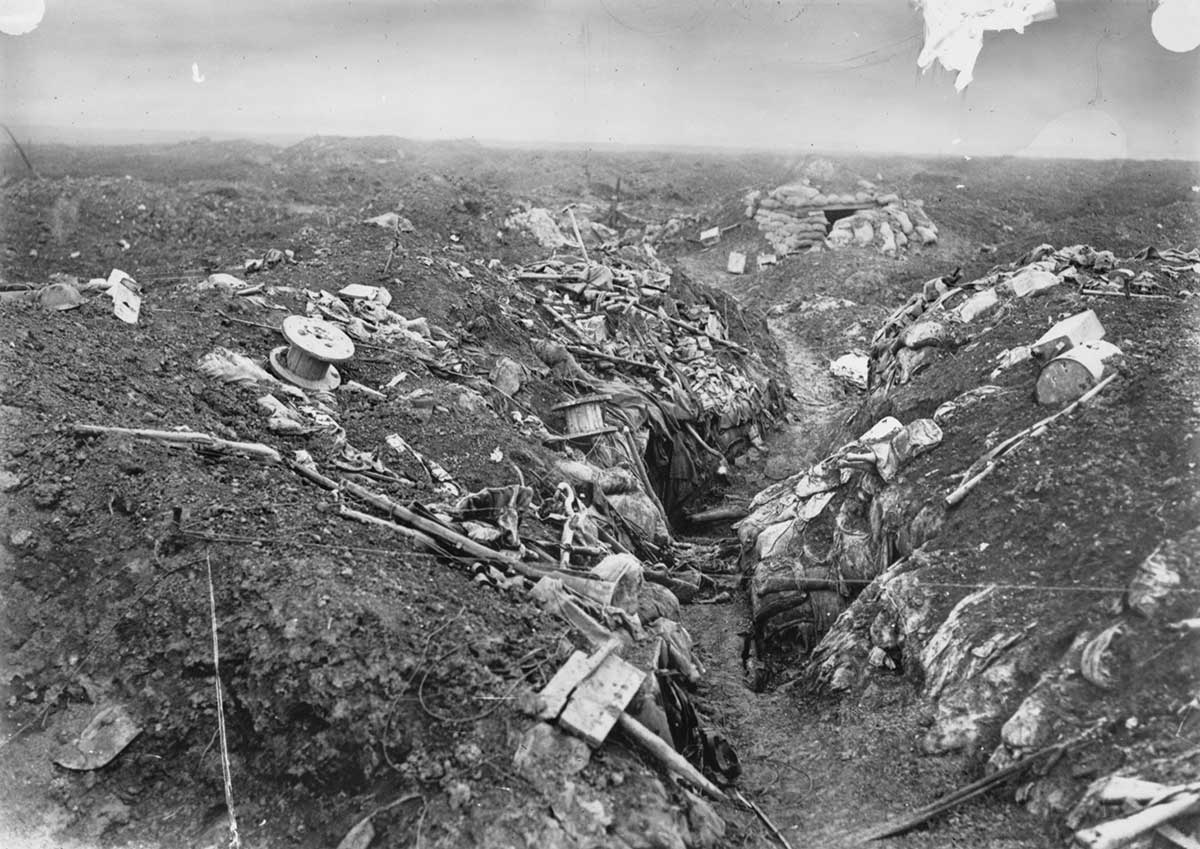 Captured German trenches at Pozières, the scene of bitter fighting and heavy bombardment, 1916