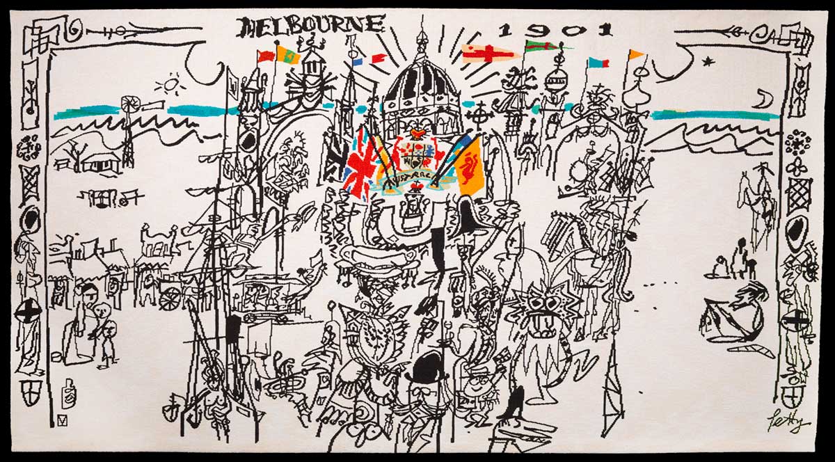 Tapestry panel titled ‘Federation Celebrations Melbourne 1901’, designed by cartoonist Bruce Petty. It is the ninth panel of ten in the Federation Tapestry Suite woven by the Victorian Tapestry Workshop (known as the Australian Tapestry Workshop since 2010), to mark the Centenary of Federation in 2001.