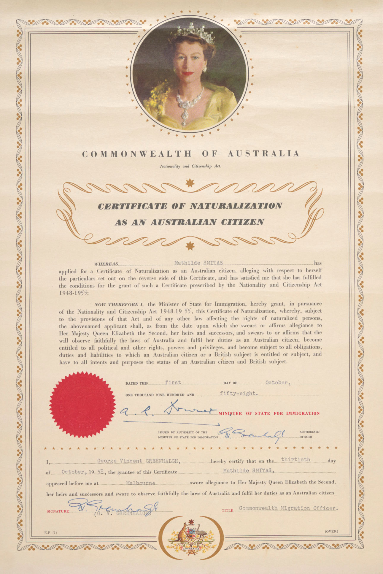 A certificate of naturalisation printed in colour on buff-coloured card. The certificate is printed with a border of wattle blossoms and leaves, and features a circular head and shoulders portrait of Queen Elizabeth II at the top of the page, and an Australian coat of arms at the bottom of the page. The certificate is made out in the name of 'Mathilde SMITAS', and dated the 1st of October 1958.