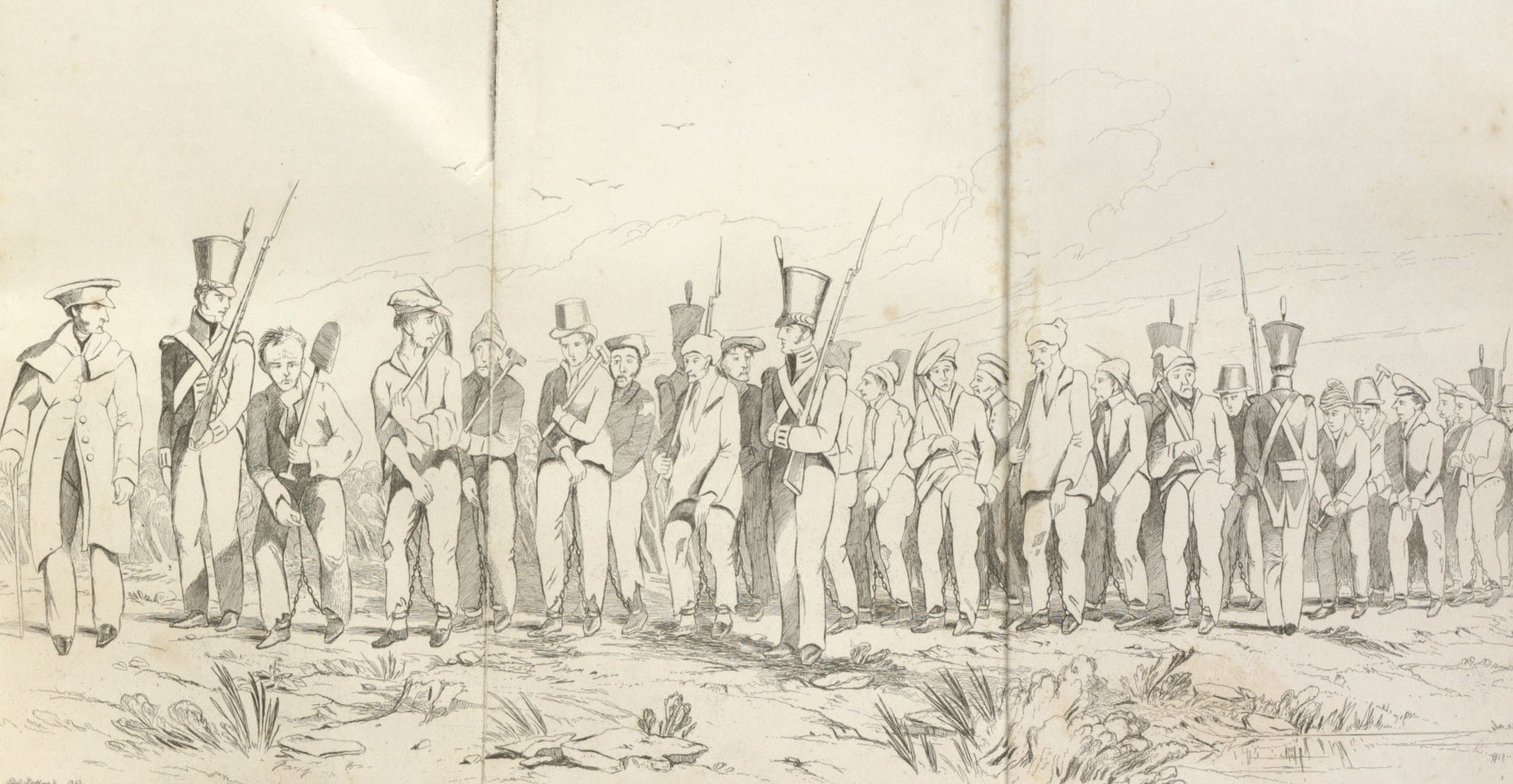A chain gang. Convicts going to work near Sidney [sic], by Edward Backhouse, 1842