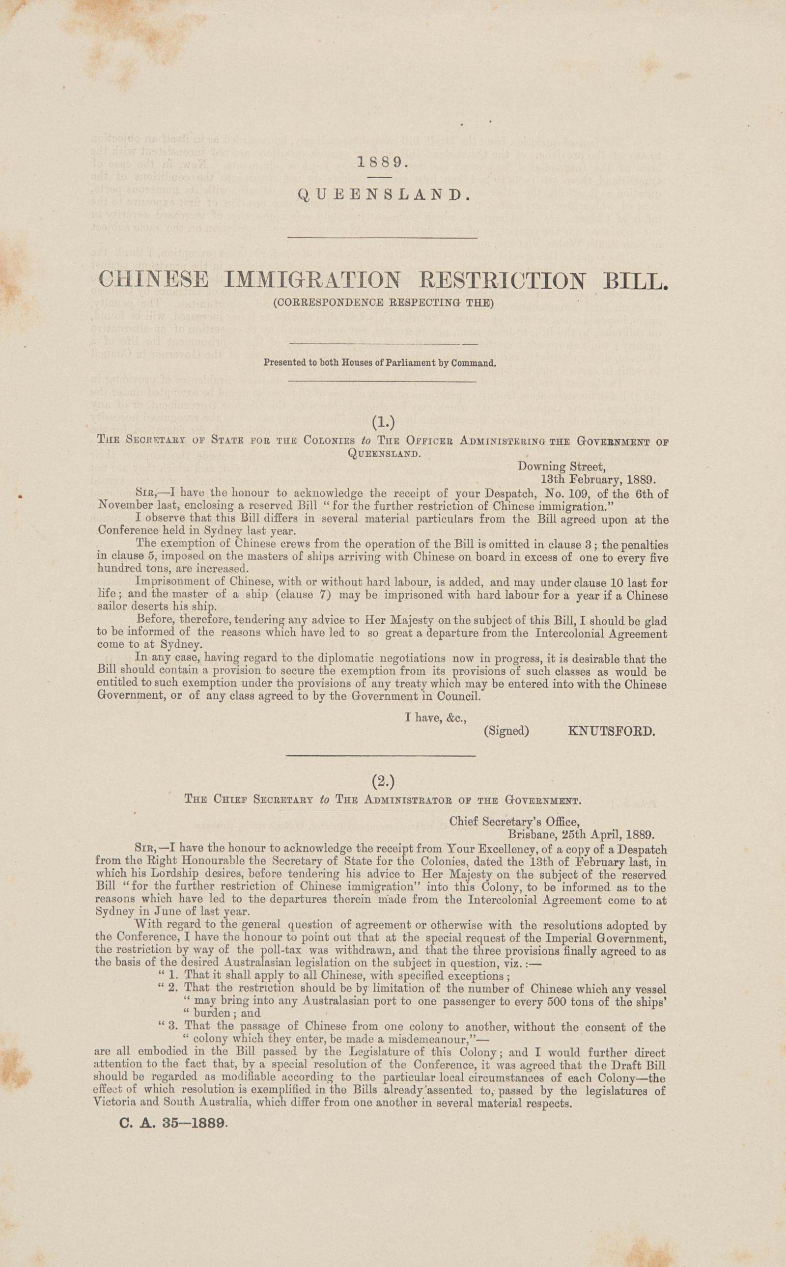 First page of a Bill introduced into the Queensland parliament in 1889 proposing to restrict Chinese immigration to Queensland. It was eventually passed by the parliament and made law.