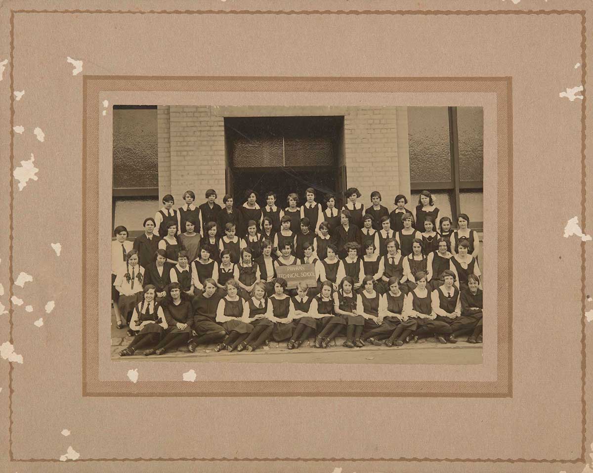 Black and white photo on a light brown mount. The photo depicts a large group of uniformed girls in four rows - front two rows seated, back two standing. A sign held by two girls at the centre, reads ‘Prahran Technical School’.