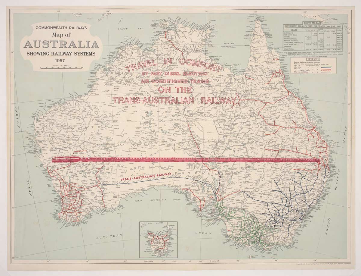 A coloured print featuring a geographical map of Australia with placenames, railways and transport routes, as well as a picture of a train in red stretching across the map.