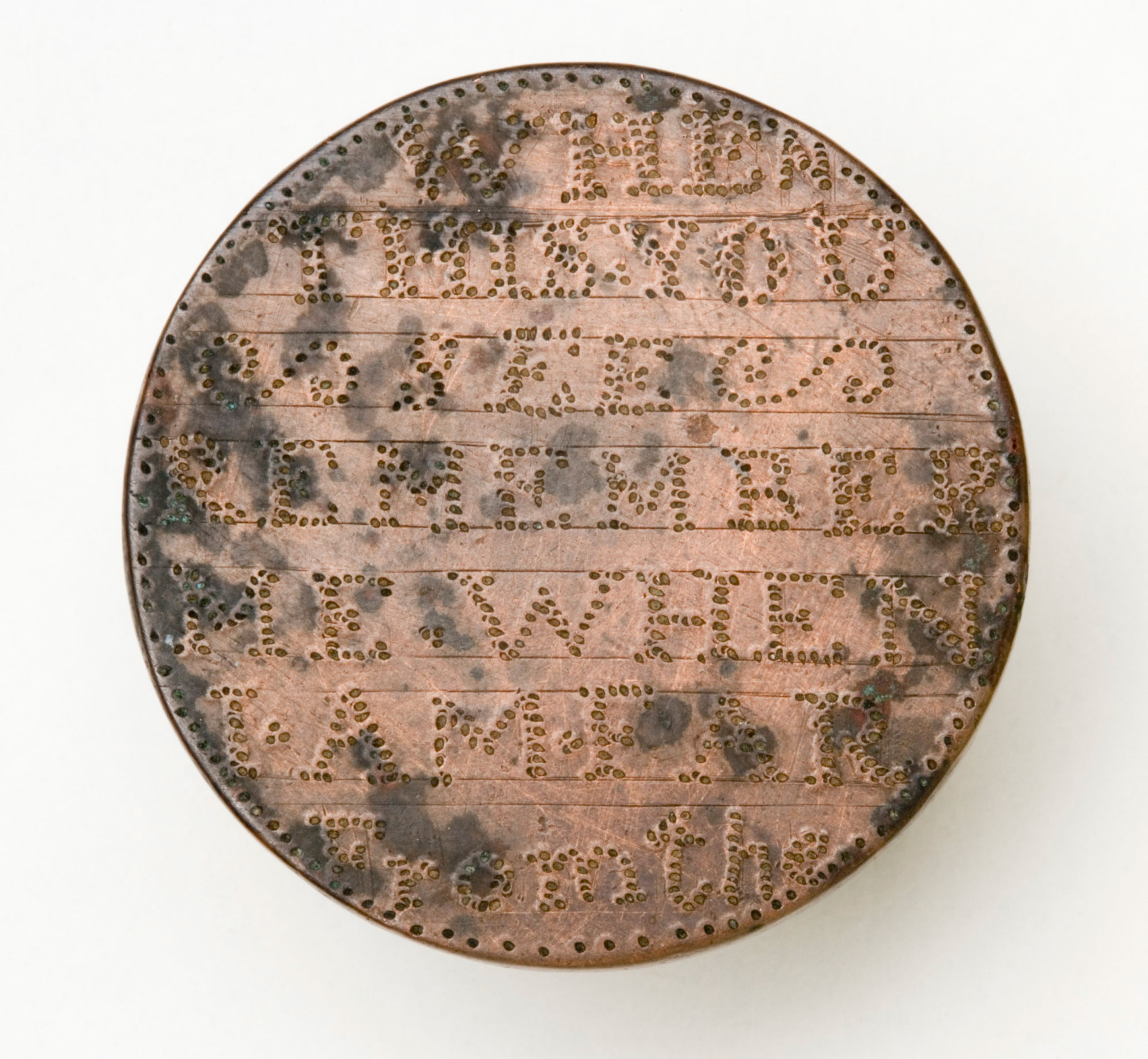 This love token is typical of tokens made by convicts from coins that they hammered flat and engraved with messages of affection and endurance. Convicts who were about to be transported to Australia gave the tokens as mementos to the loved ones they were leaving behind. Some tokens include the length of sentence, either seven or fourteen years, and popular phrases and rhymes of separation. Convict love tokens are one of the few examples of items made by convicts which have survived. This token reads: When this you see remember me when I am far from thee.
