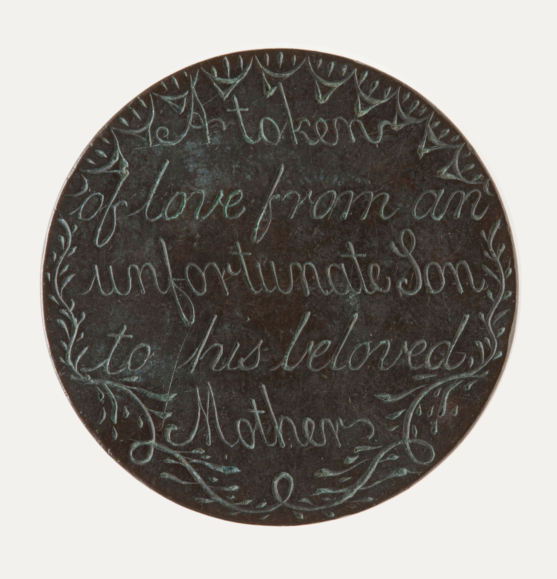 This love token is typical of tokens made by convicts from coins that they hammered flat and engraved with messages of affection and endurance. Convicts who were about to be transported to Australia gave the tokens as mementos to the loved ones they were leaving behind. Some tokens include the length of sentence, either seven or fourteen years, and popular phrases and rhymes of separation. Convict love tokens are one of the few examples of items made by convicts which have survived. This token reads: A token of love from an unfortunate son to his beloved mother.