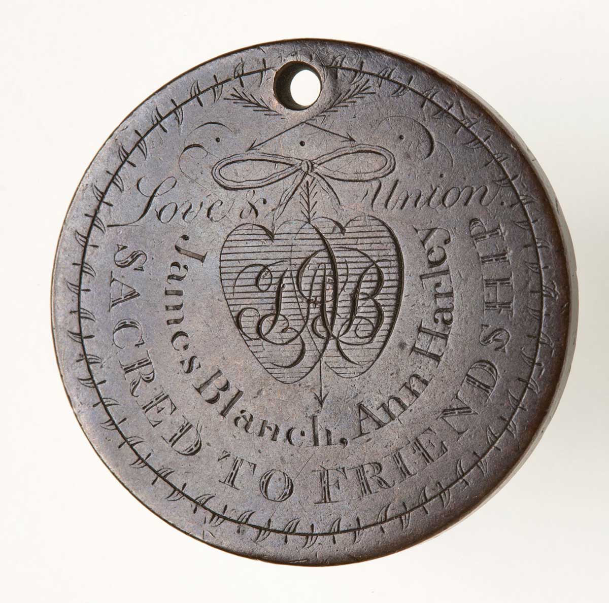 This love token is typical of tokens made by convicts from coins that they hammered flat and engraved with messages of affection and endurance. Convicts who were about to be transported to Australia gave the tokens as mementos to the loved ones they were leaving behind. Some tokens include the length of sentence, either seven or fourteen years, and popular phrases and rhymes of separation. Convict love tokens are one of the few examples of items made by convicts which have survived. This token reads: James Blanch, Ann Harley / Sacred to Friendship.