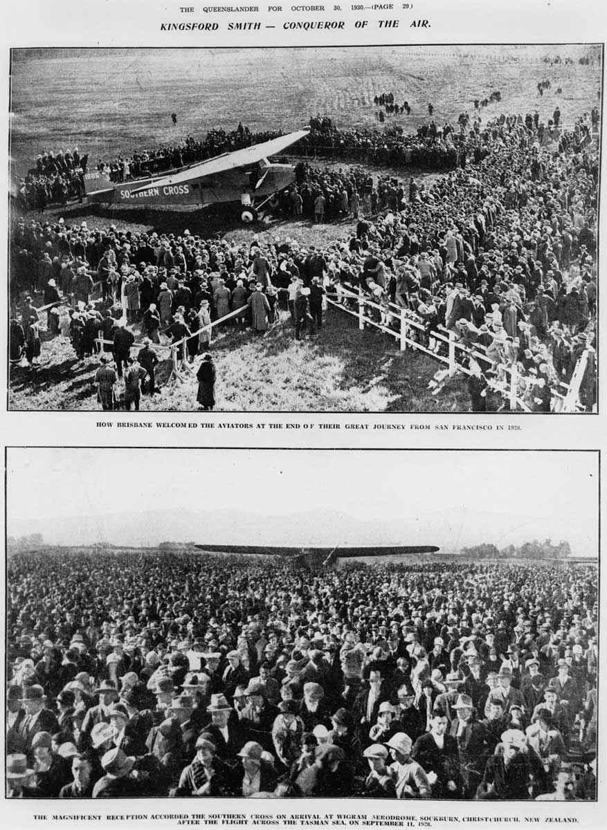 Top photograph shows Kingsford Smith’s Southern Cross in the centre of a huge crowd when he landed at Brisbane after flying from San Francisco. The lower photograph shows only the wings of Southern Cross visible in the crowd at Wigram Aerodrome, Christchurch, New Zealand.