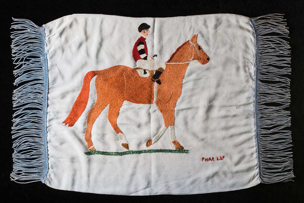 Cushion cover with hand embroidered image of Phar Lap and jockey