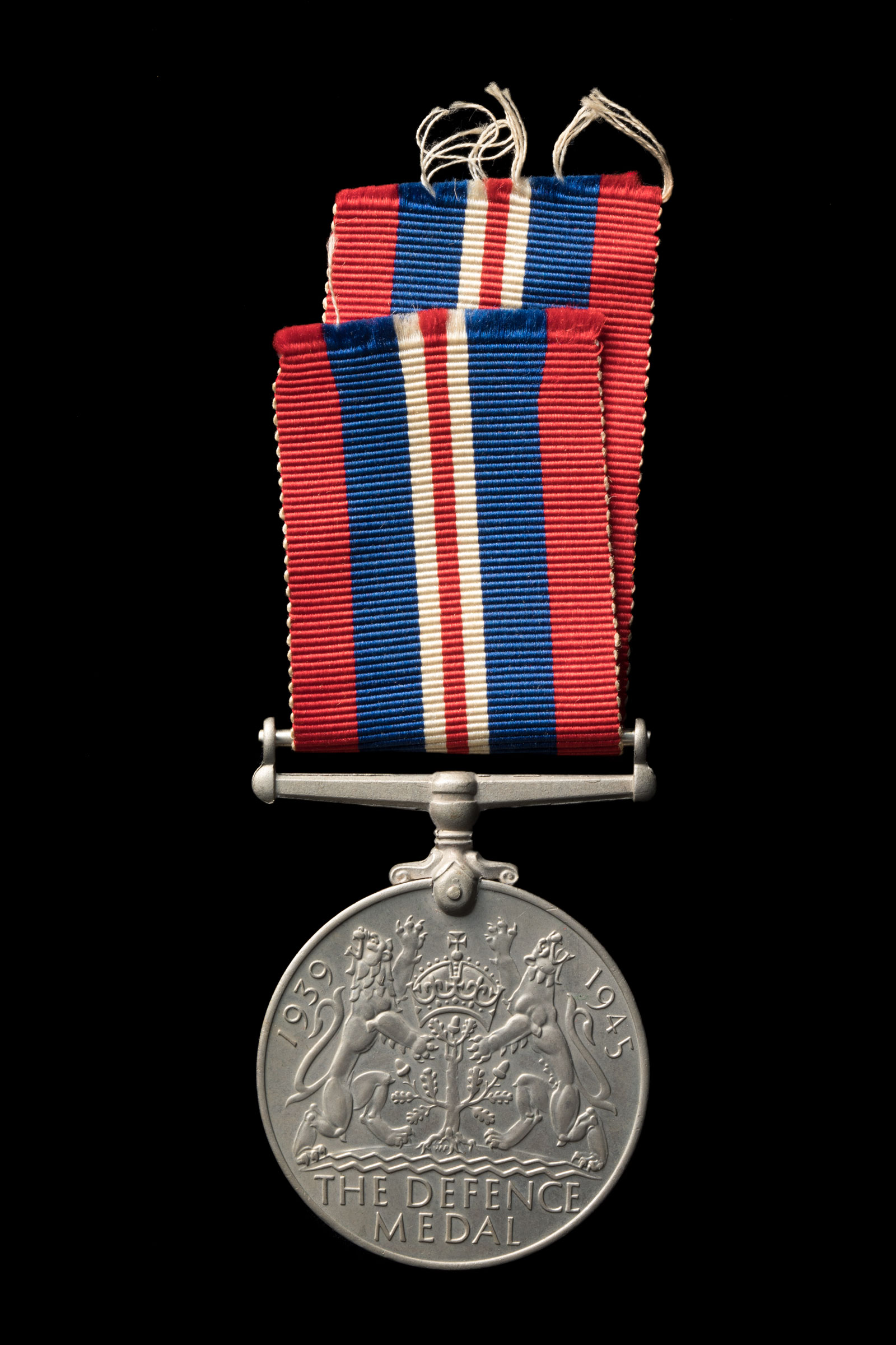 A circular silver medal, with the face of King George the 6th on one side and on the other an emblem incorporating two lions, a crown and an acorn tree. The medal is inscribed ‘1939 1945 The Defence Medal’ and is held by a red, white and blue ribbon.