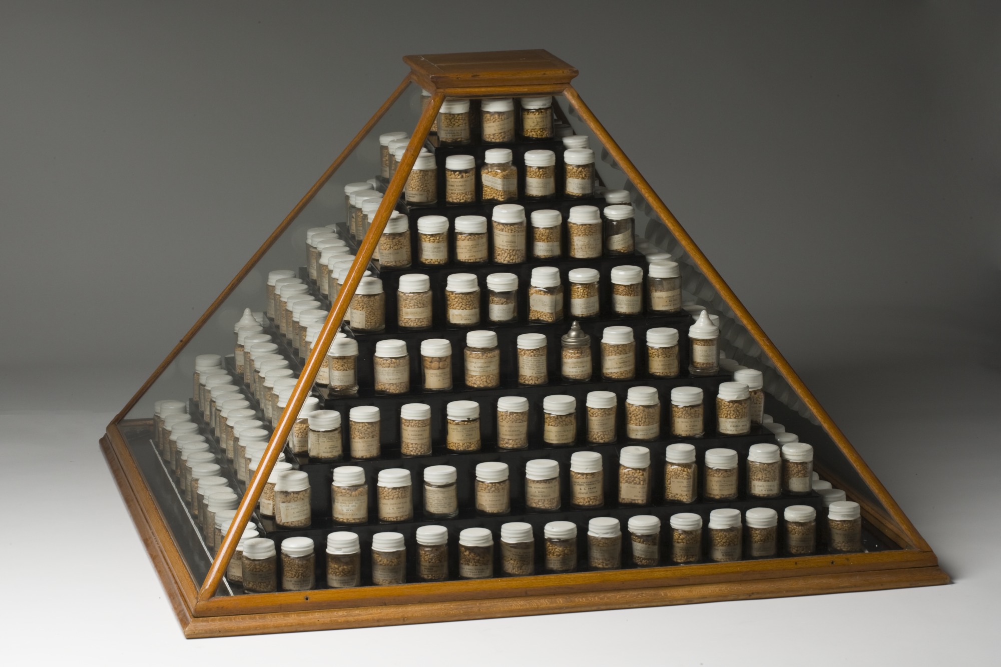 Approximately 252 small cylindrical and square glass jars containing a range of prize winning wheat samples with small paper labels and with screw top lids covered in heat sealed white plastic. The labels record the year, name, place and strain.
