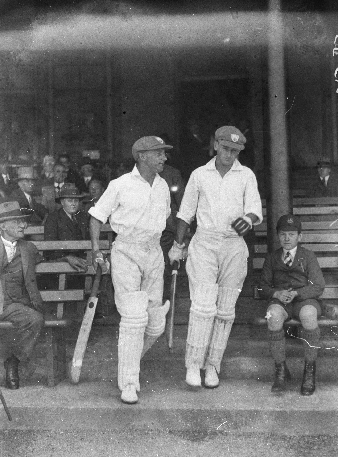 Don Bradman (left) and Stan McCabe take the field, 1932
