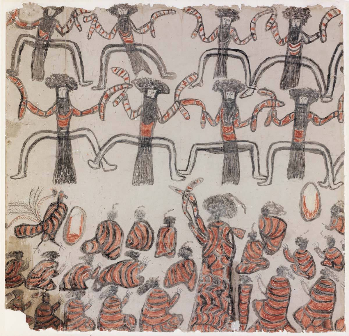 Drawing by William Barak in pencil, black and red ochre earth pigments and watercolour on paper. The drawing depicts two groups of figures performing a ceremony. Born in 1824, William Barak was an Aboriginal leader whose skills as a diplomat were legendary. Renowned as the ngurungaeta or headman of the Wurundjeri clan of the Woiworung people (Kulin nation), whose land encompasses the present-day city of Melbourne, he was reputedly among those to witness the arrival of John Batman and his party at Port Phillip as a twelve-year-old child. Barak's paintings depict important features of Aboriginal society. He left a distinctive and valuable record of his culture in the fifty or so surviving drawings that are held in private and public collections today.