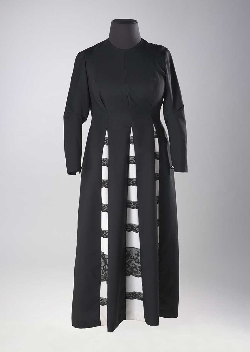A black long-sleeved dress. The dress features a scoop neck and three white panels extending from the waistline with black lace overlay. This dress belonged to Dame Enid Lyons, who became the first woman elected to the Australian House of Representatives when she won the Tasmanian seat of Darwin in 1943. In 1949 she became the first woman to serve in the federal Cabinet.