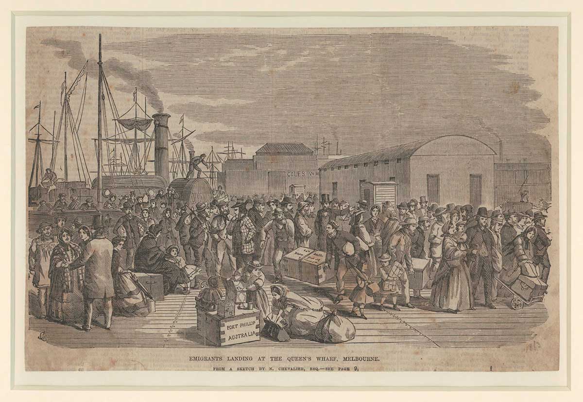 An illustration of migrants arriving in Melbourne, published in the 1860s.