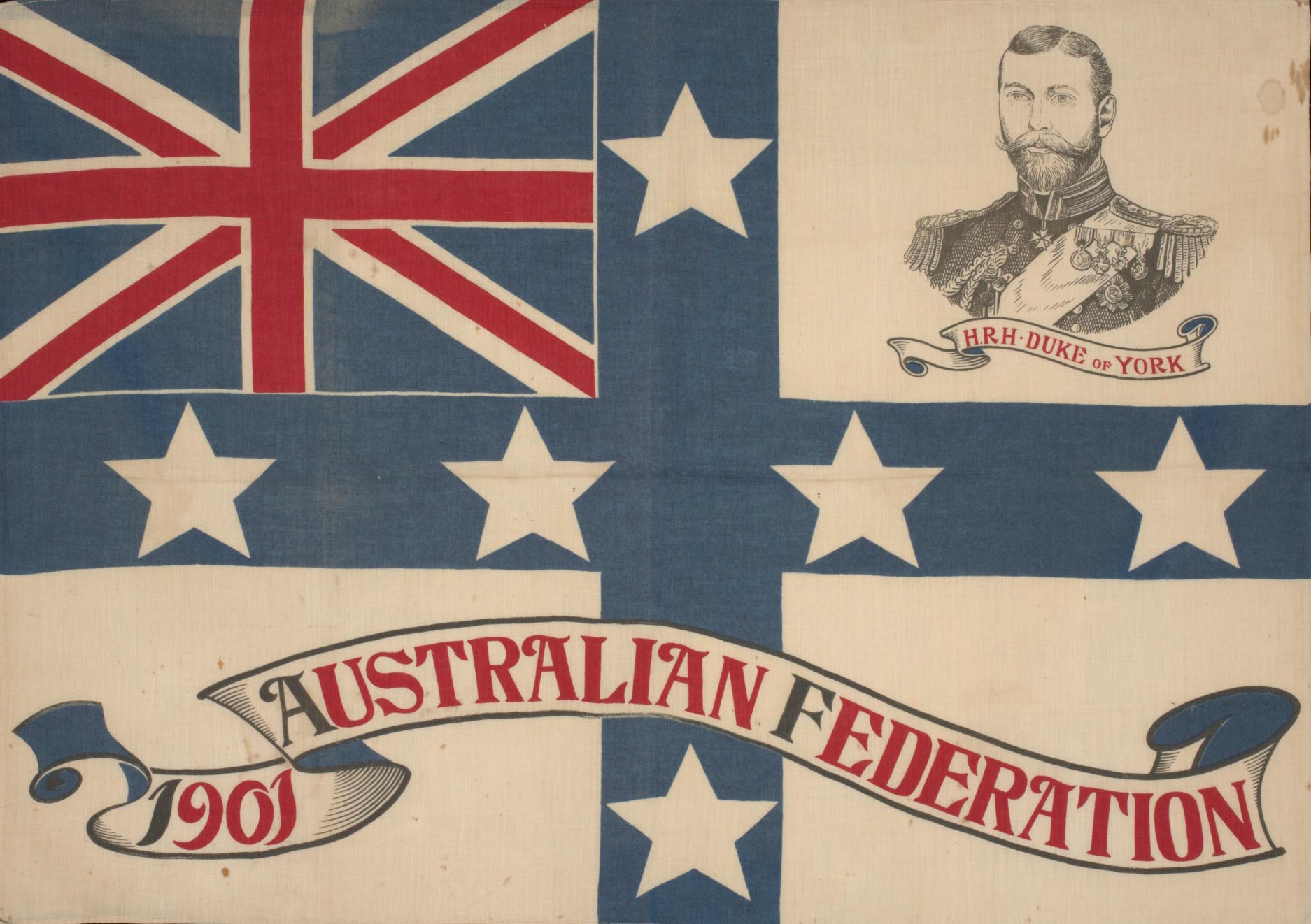 This flag was most likely produced as street decoration celebrating the opening of the first Federal Parliament in Melbourne by the Duke of Cornwall and York (later King George V) on 9 May 1901. It incorporates elements from the Australian Federation League's original Federation flag design from 1890, including the Southern Cross motif, representing the six Australian states, and the Union Jack, showing Australia's ties to the United Kingdom. Australia's loyalty to empire is also shown through the royal portrait of the Duke. This flag lends insight into the origins of today's Australian flag.