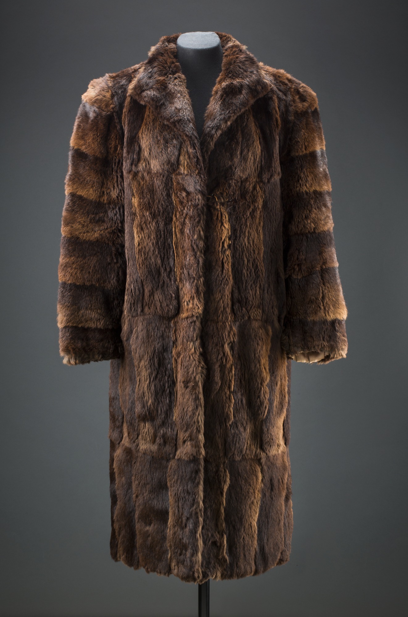 A dark brown rabbit fur coat with light tan coloured fabric lining. The coat comprises many small rectangular rabbit pelts sewn together. Light and dark areas of fur give the coat a striped appearance, especially on the sleeves. A section of lining has been cut away from the hemline making it shorter than the outer fur layer. The lining is pinned to the coat in several places. The underside of some pelts and hand-stitched white fabric tape is visible along the hemline. A single hook and loop closure fastens the coat at the chest.