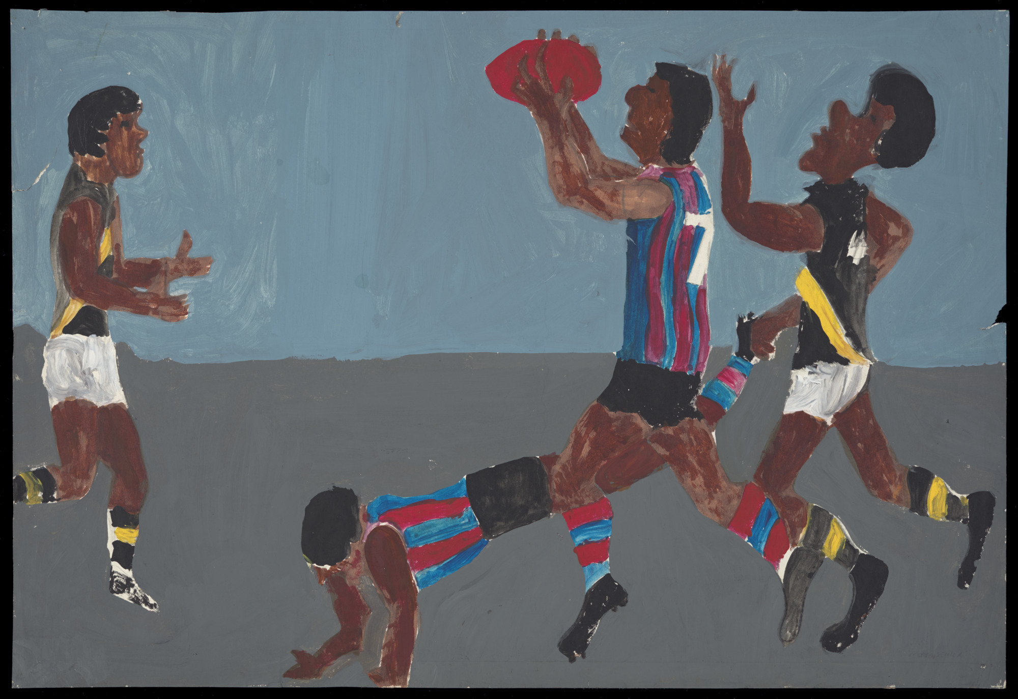 Child's drawing, paint on paper. Shows four figures playing football. Artist: Mervyn Robuntja. Location: Yirara College, Alice Springs, Northern Territory.