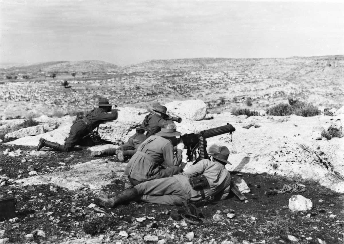 Four unidentified members of the 3rd Australian Light Horse Regiment and machine gun in action at Khurbetha-Ibn-Harith, 31 December 1917