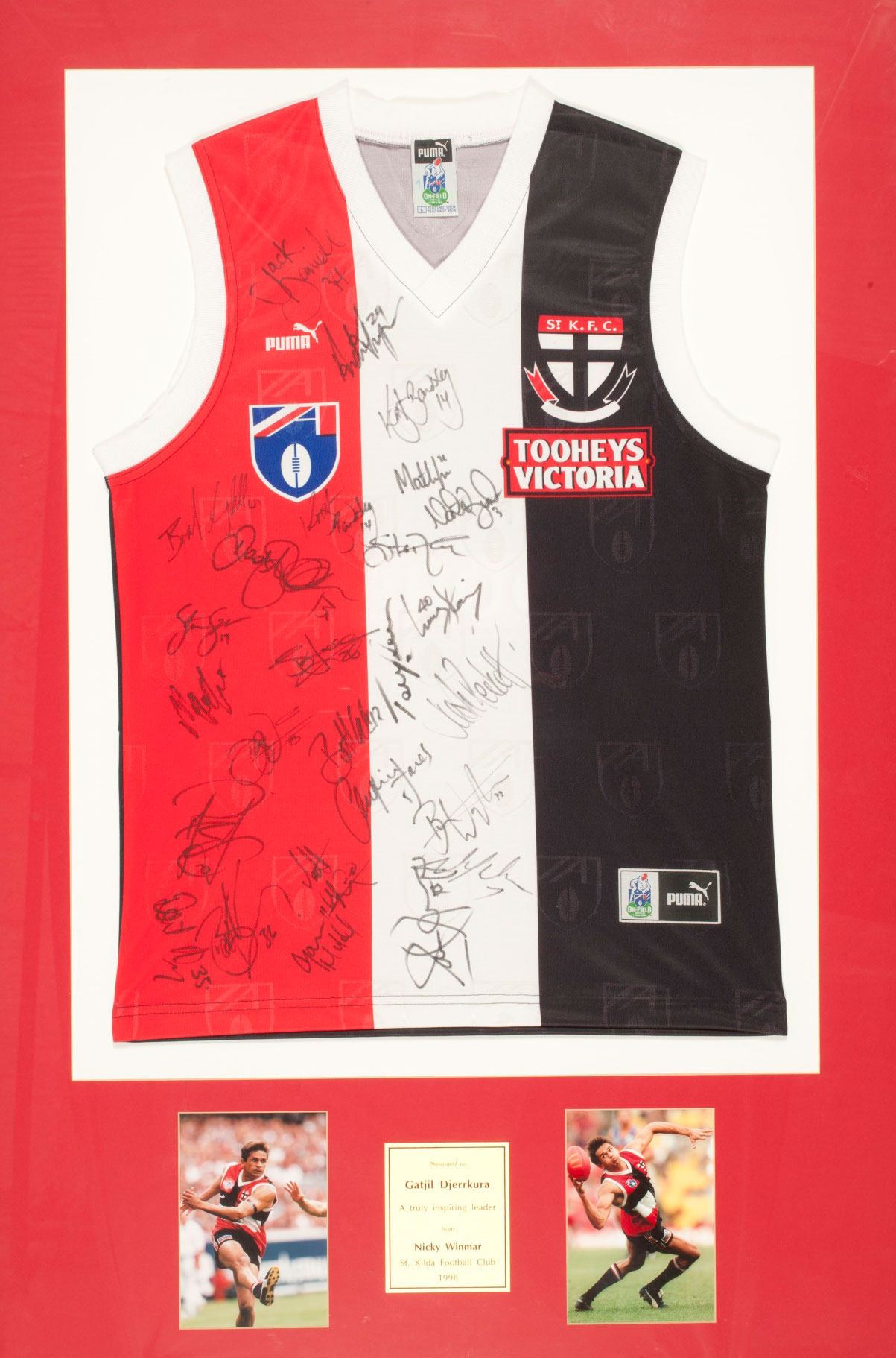 An AFL St Kilda football jersey signed with two colour photographs of a football player at the bottom. In between the photographs is a gold plaque that reads ‘Presented to / Gatjil Djerrkura / A truly inspiring leader / from / Nicky Winmar / St Kilda Football Club / 1998’.