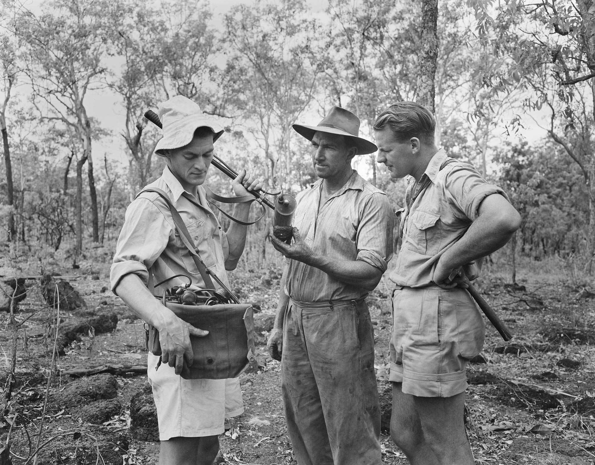 Geologists examining an ore sample with a Geiger counter at Rum Jungle