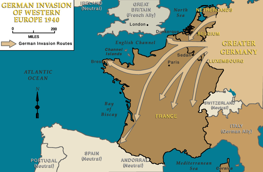 Beginning in May 1940, Germany unleashed its Blitzkrieg, or ‘Lightning War’, in Western Europe. German forces invaded Belgium, the Netherlands, Luxembourg and France. Belgium and France surrendered.