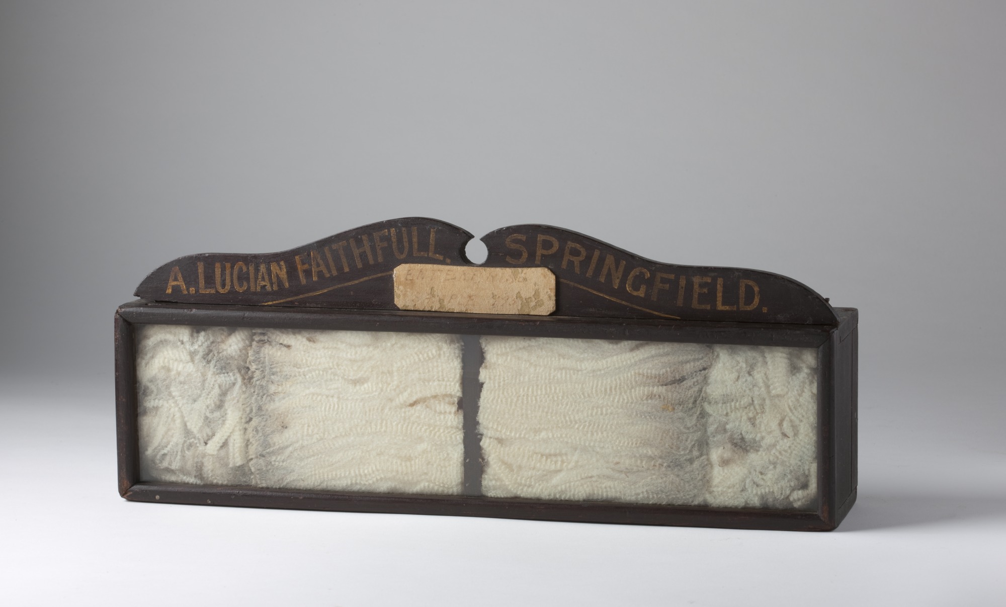 Glass-fronted wooden box, displaying a wool sample. Painted on a wooden banner at the top of the box: ‘A. LUCIAN FAITHFULL. SPRINGFIELD.’ Handwritten on a piece of card below this is: ‘ENTERPRISE / SAMPLE 195.’