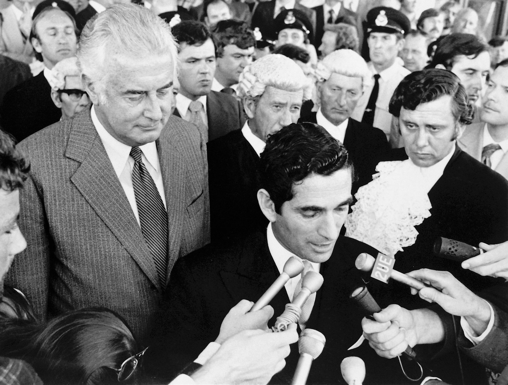 Gough Whitlam and David Smith on the steps of parliament house, 11 November 1975