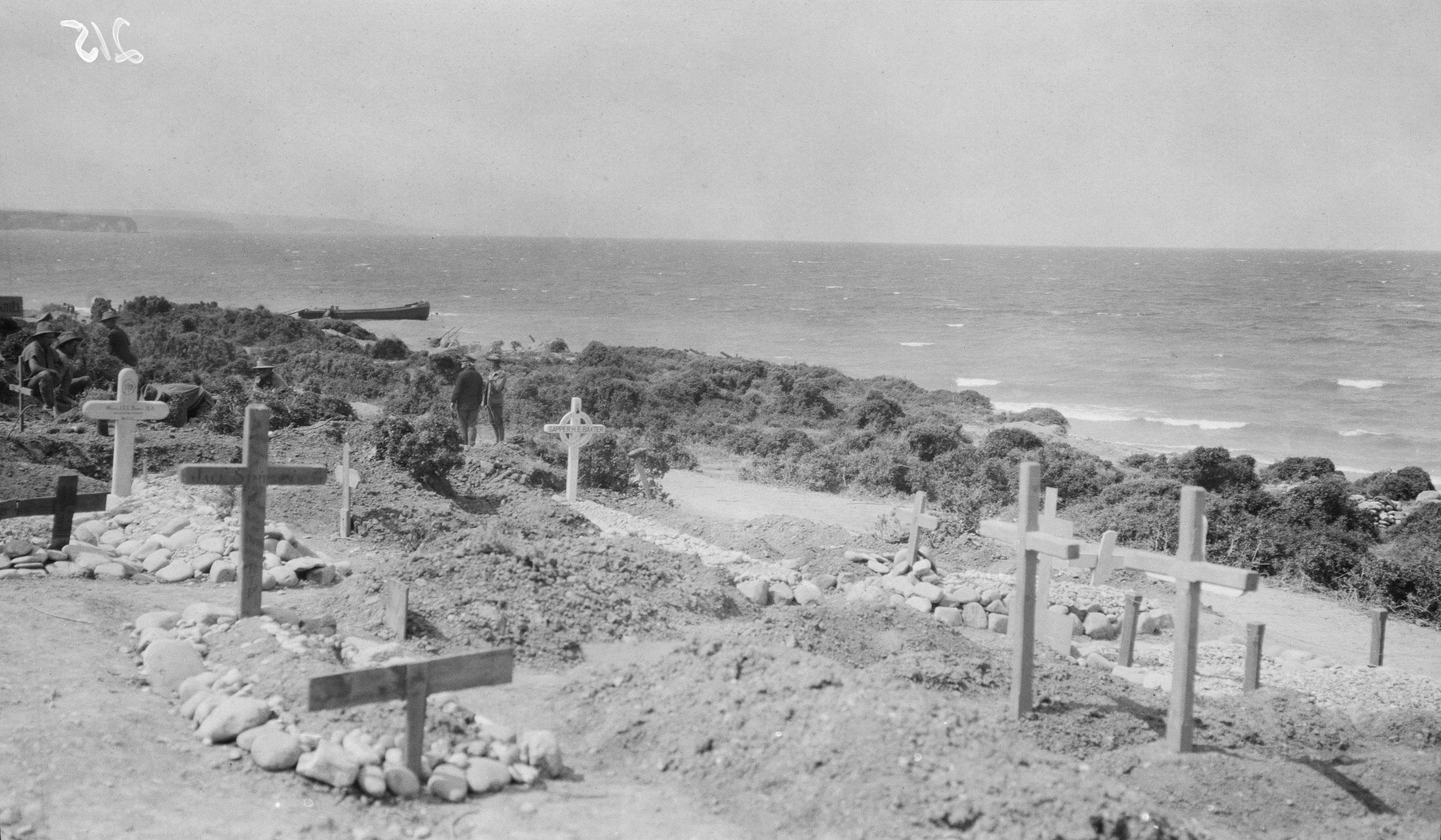 The cemetery on Queensland Point at the mouth of Shrapnel Gully, which was probably the largest Australian cemetery at Anzac.
