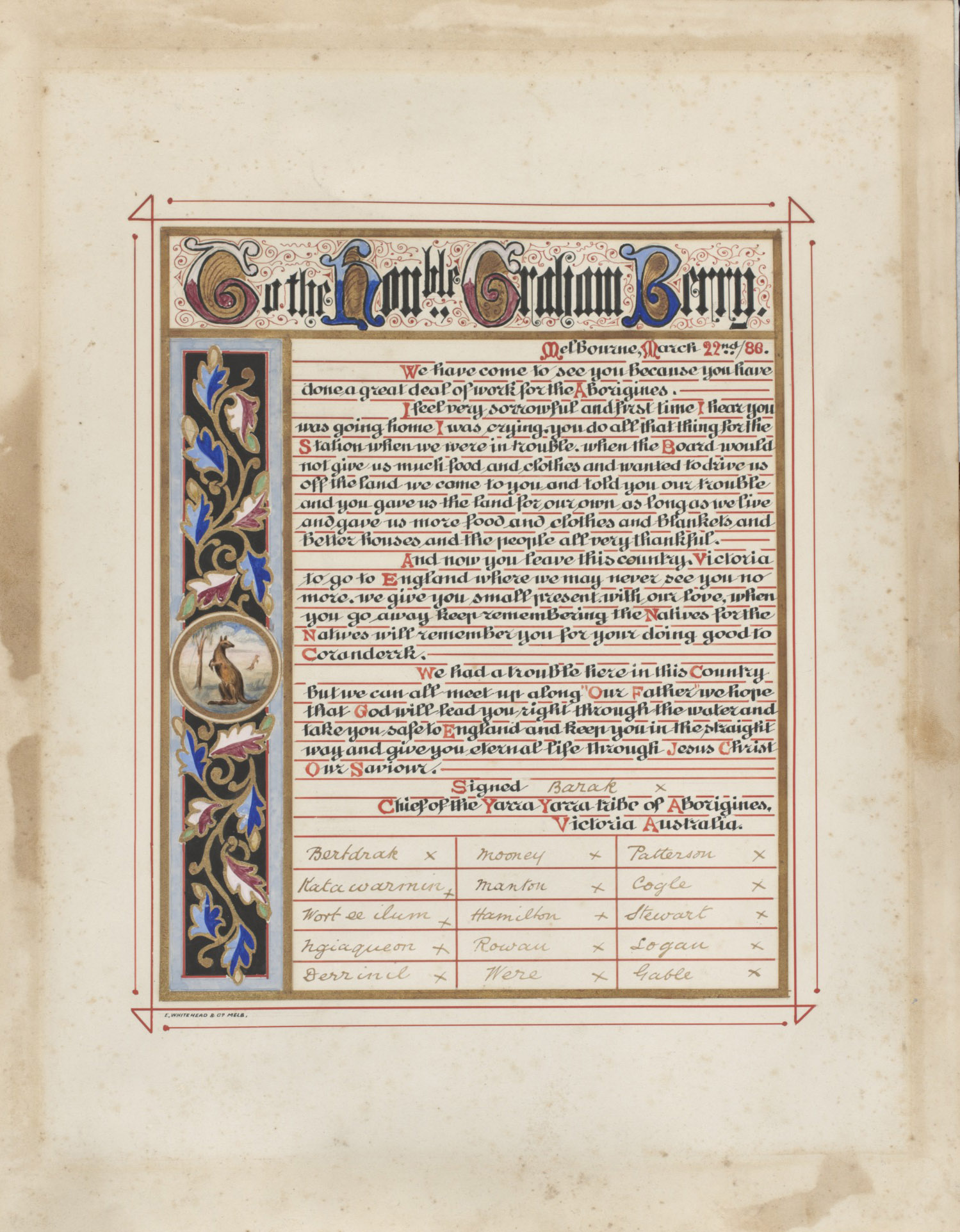 Illuminated address presented by William Barak and 15 Coranderrk residents to Graham Berry, 1886