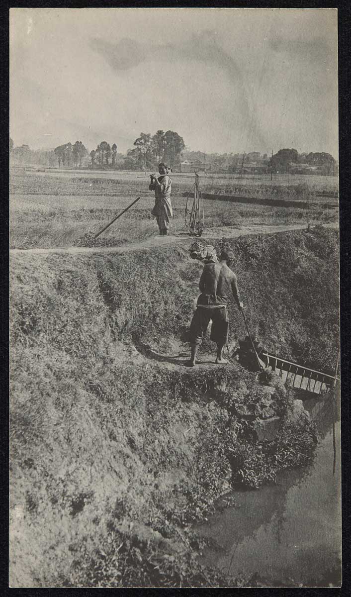 A black and white photograph of two labourers working in a field with water and irrigation devices in the lower right corner of the photograph, 1920.