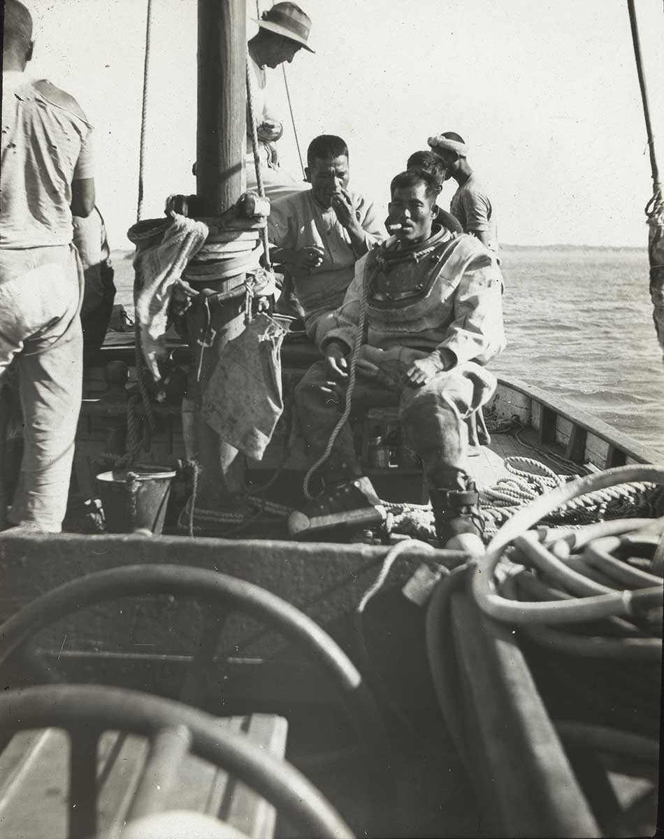 Note the diver in his wetsuit, waiting for his next dive, when his helmet and additional weights will be attached to his gear.