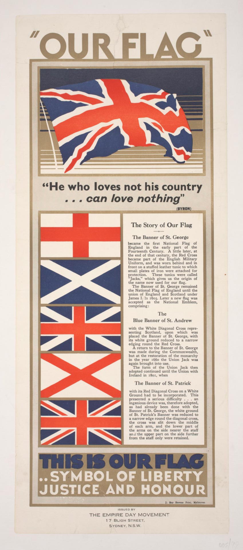 The poster aims to explain the origins and symbolism of the Union Jack, which is present in the canton (top left corner) of the Australian flag. It contains images of the crosses of St Andrews, St George and St Patrick representing the countries of Scotland, England and Ireland respectively. Together, these three flags make up the Union Jack. The poster encourages patriotism with a quote from Lord Byron: ‘He who loves not his country can love nothing’.