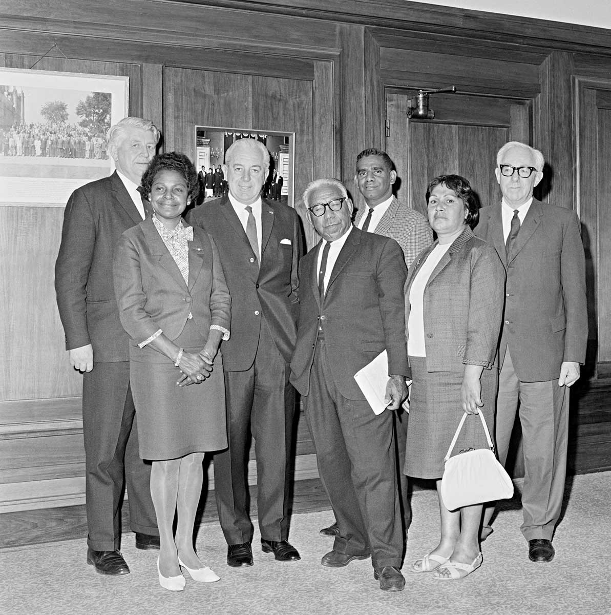 From left to right: Gordon Bryant MP, Faith Bandler, Harold Holt, Pastor Doug Nicholls, Burnum Burnum (Harry Penrith), Win Branson and WC Wentworth.