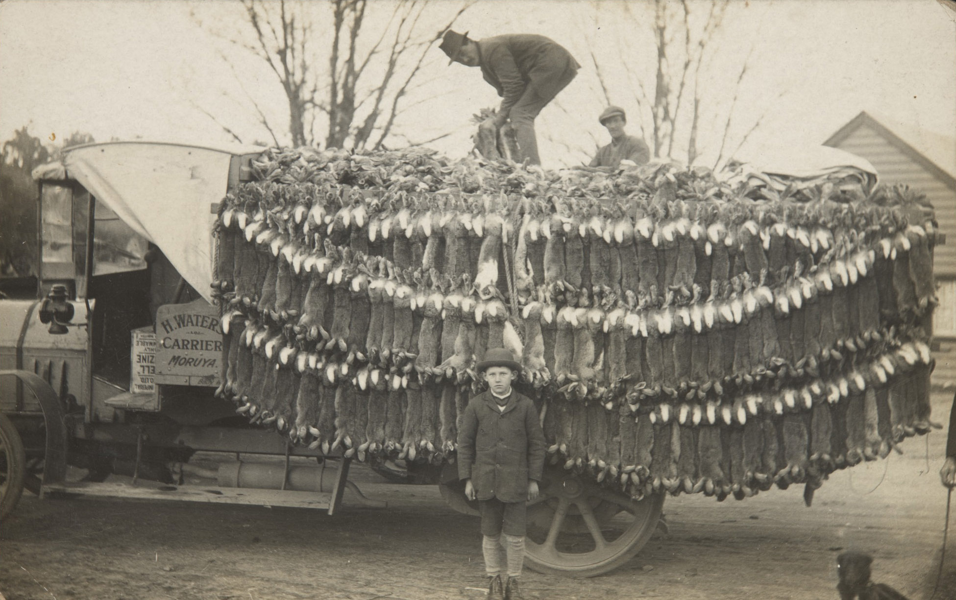 Postcard with an image of a lorry loaded with dead rabbits. On the reverse is the handwritten inscription, ‘This is one of the industries of Braidwood. This is a lorry load of rabbits being despatched to the Freezing Works. Some men earn from £10- to £12- a week trapping rabbits. They are very plentiful here.’