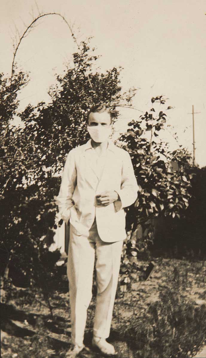 Man wearing a white suit and face mask during Spanish flu pandemic, 1918