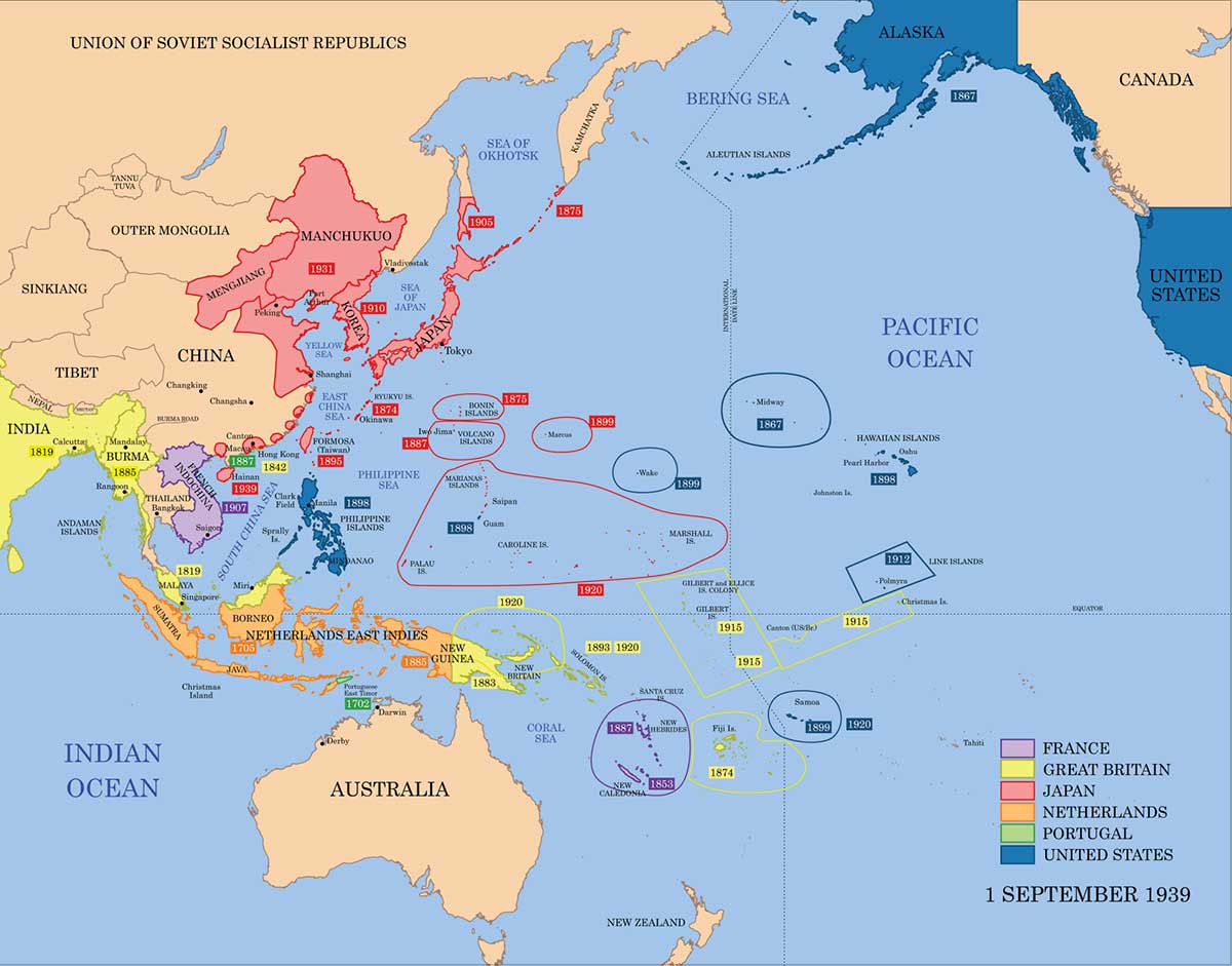 Dates shown indicate the approximate year that the various powers gained control of their possessions. Japanese control of territory in China was tenuous.